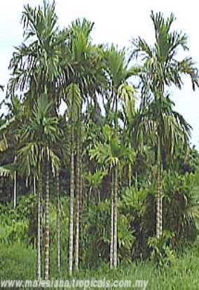 Description: This species is widely grown in the tropics for its fruit, the betel nut, which is chewed as a mild stimulant. It is a beautiful palm with a solitary ringed trunk sometimes reaching over 15 meters in height.