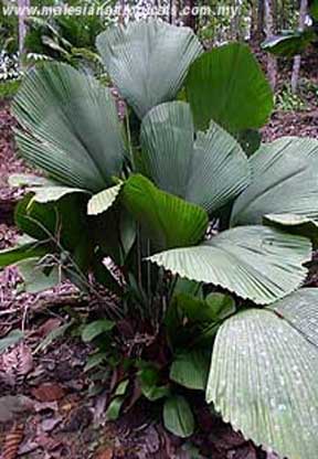 Description: A attractive and rare fan palm native to shady hill forest of Borneo. The dull green leaves are diamond-shaped and are supported on 1-metre long petioles.