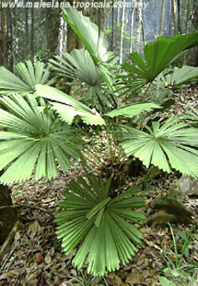 Description: A large understory fan palm native to Sarawak and West Kalimantan. The leaves, which can be nearly a meter in diameter, are divided into 15 or more wedge-shaped segments. Old plants of this species can develop a short trunk.