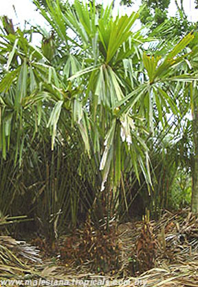 Description: A giant fan palm native to the forests of Borneo. The long petioles are boldly striped with yellow and dark green and are armed with ferocious spines. Old specimens can reach over 15 meters in height.